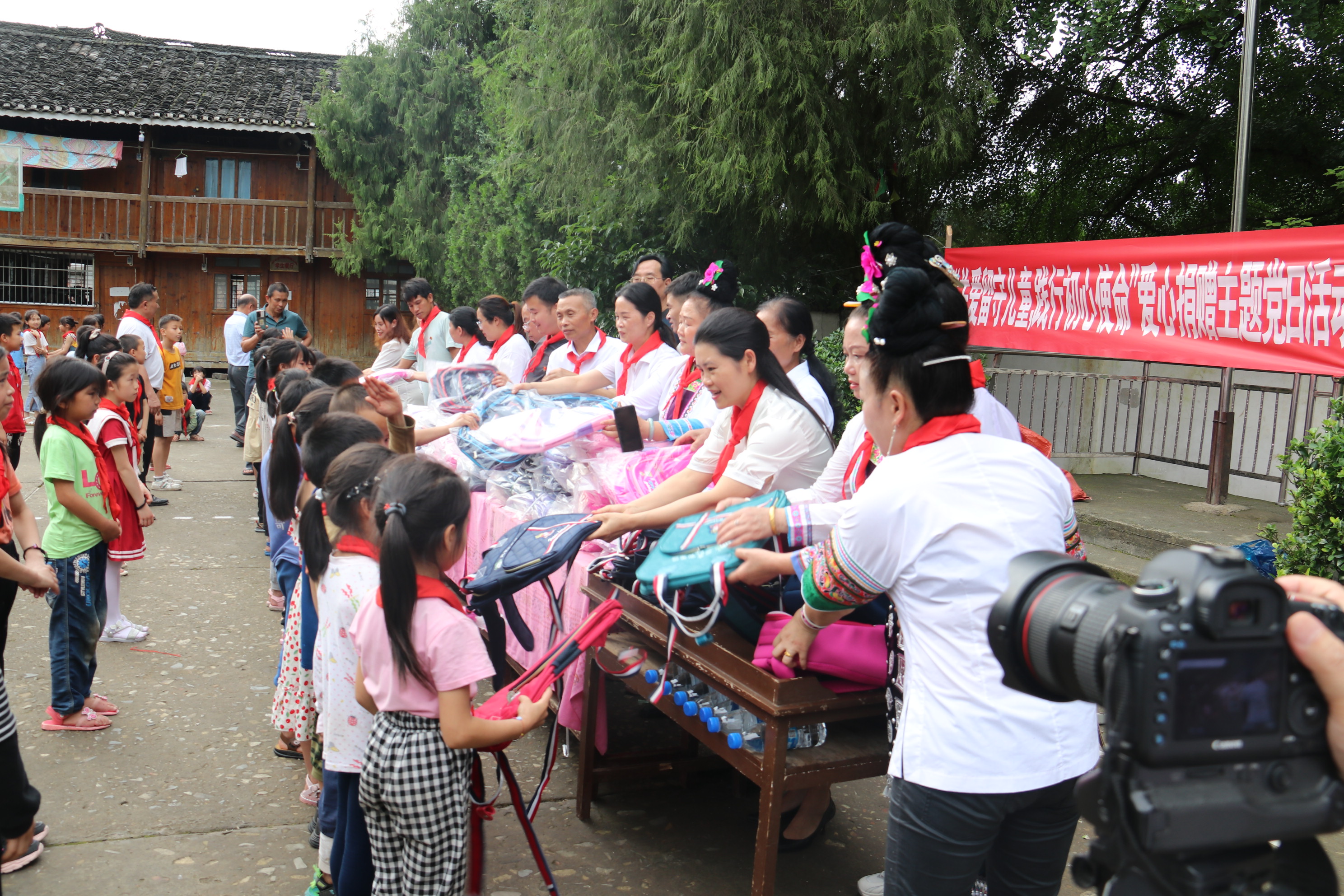 捐赠活动上,首先由黎平县坝寨乡蝉寨小学少先队员代表为主席台上的领导和嘉宾敬献并佩戴红领巾。