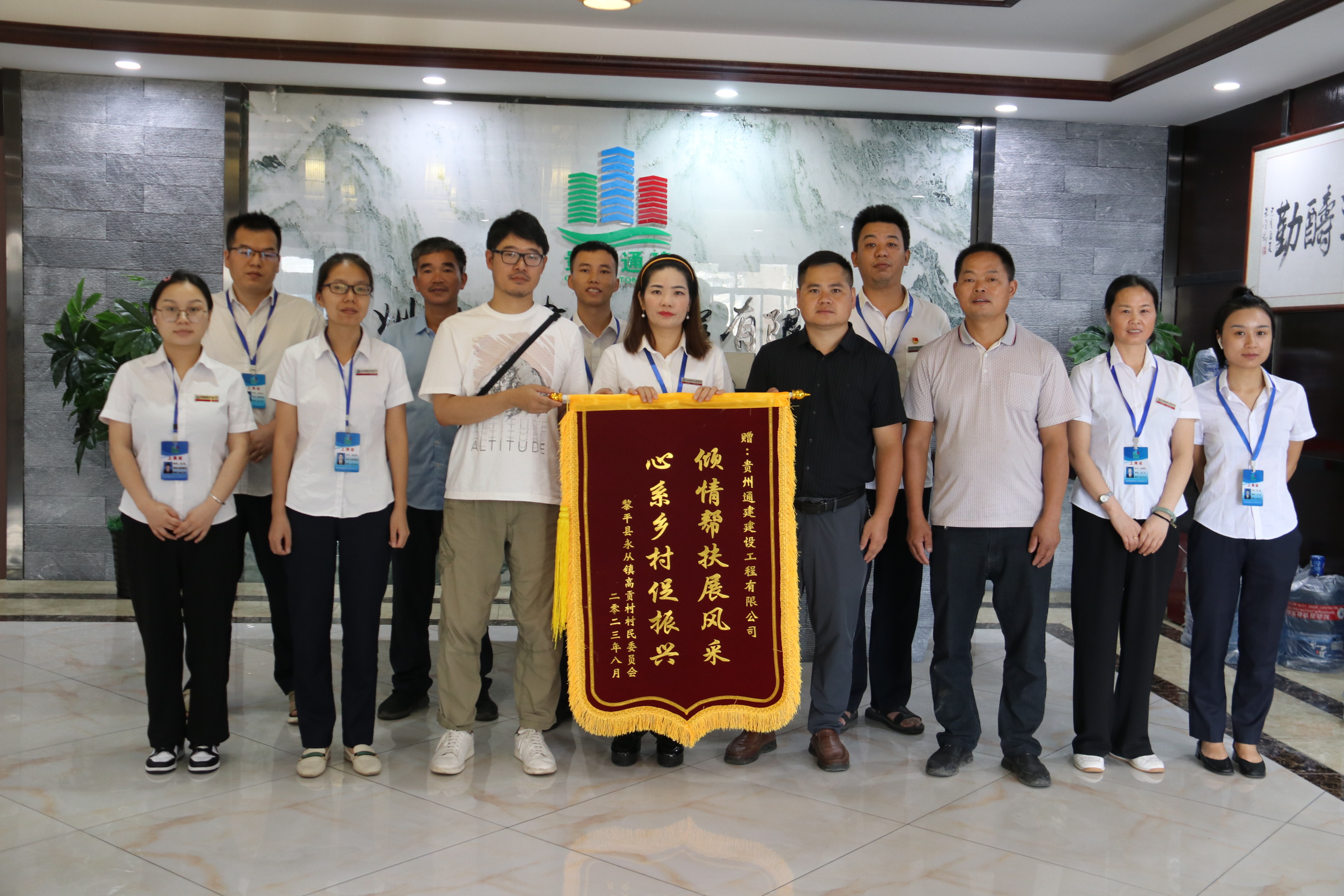 2023年8月4日上午,黎平县永从镇高贡村驻村第一书记秦周斌、村支书陆家高、村监委陆家宏等一行专程来到贵州通建建设工程有限公司,代表永从镇高贡村村民委员会及高贡村的父老乡亲,将一面印有“倾情帮扶展风采,心系乡村促振兴”的锦旗,亲手赠送到贵州通建建设工程有限公司常务副总经理吴香柳、总经理助理付金成手中,以感谢贵州通建公司在和美城乡“四大行动”中对高贡村的倾情帮扶、助力乡村振兴、办实事、做好事、解难事表达最诚挚的谢意。 查看更多08-042023 -