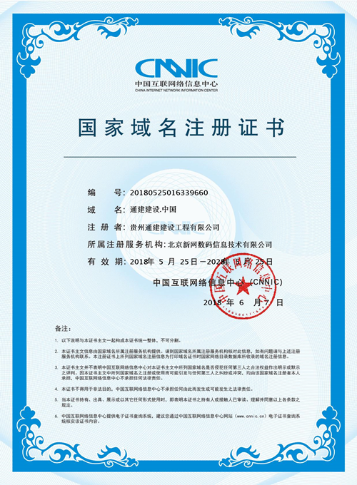 2017年10月“贵州通建”网站的开通,拉开了贵州通建建设工程有限公司新一轮发展的序幕。承蒙社会各界的支持与厚爱,加上“贵州通建”人对建筑事业孜孜不倦的执著追求和锲而不舍的敬业精神以及渴望成功的梦想,今天,域名“通建建设”已由贵州通建建设工程有限公司注册,并在国内顶级域名数据库中备案后正式落户“贵州通建”网站,敬请各位新老朋友关注。